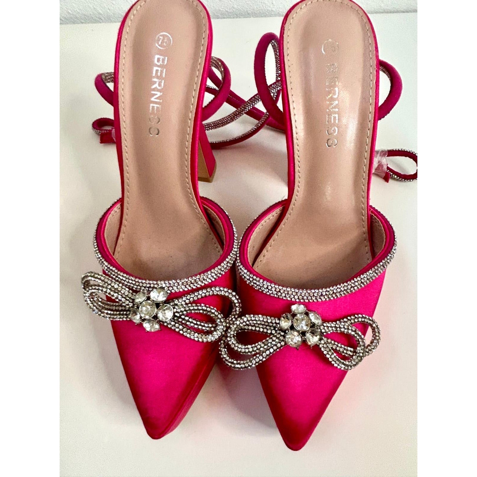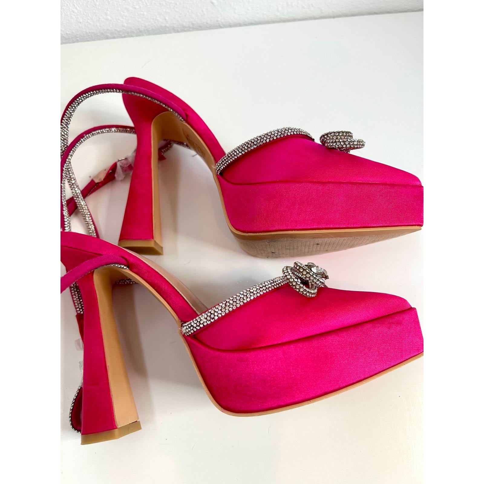 These heels are crafted from pink satin and feature a pointed toe with an elegant double-rhinestone bow embellishment. They include rhinestone-encrusted ankle straps for added sparkle